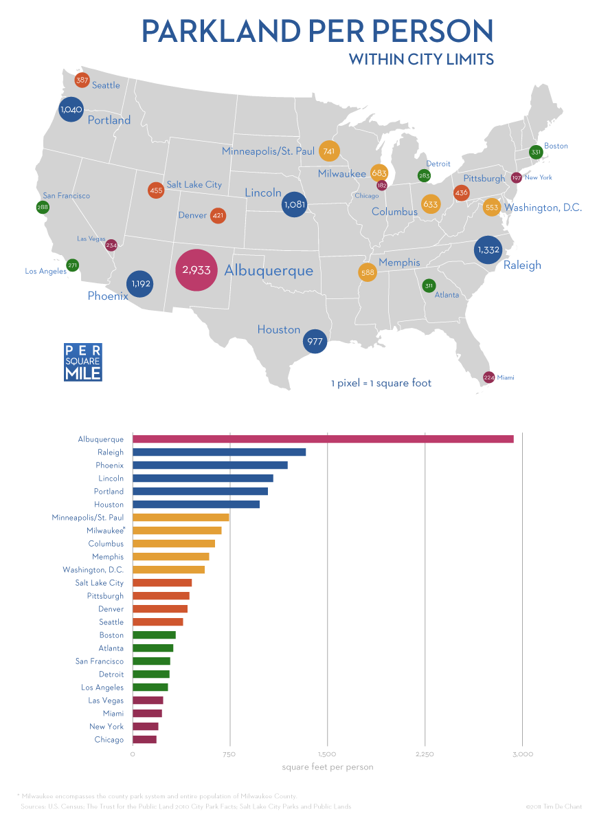For reference, Berkeley has 102,822 residents and 230 acres of parkland within its city boundaries—including the marina. That equates to 97 square feet of parkland per person, well below Chicago, which has 182 square feet per person.
